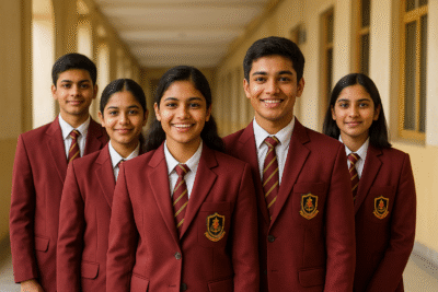 “Indian and expat students in beige blazers by YFM School Uniforms showcasing unity and pride”